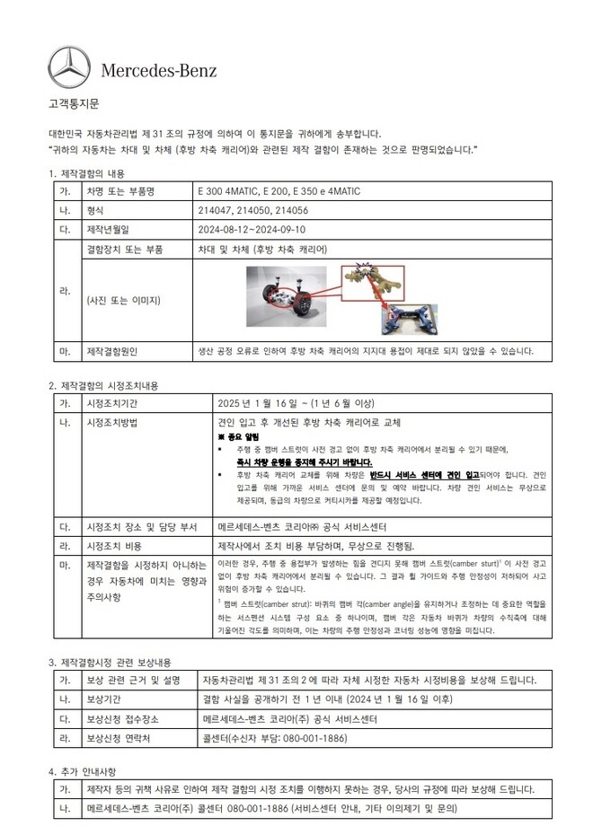 [하비엔뉴스 = 홍세기 기자] 벤츠 E클래스 3개 차종이 주행 중 캠버 스트럿(차량 바퀴 기울기 각도 조정 및 유지하는 부품)이 사전 경고 없이 후방 차축에서 분리될 수 있는 것으로 나타나 즉시 운행 중지 및 리콜이 진행된다.