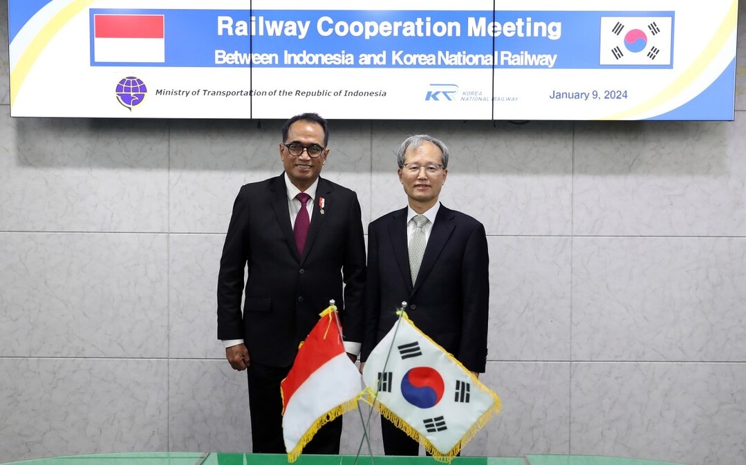 | 김한영 국가철도공단 이사장(오른쪽)과 부디 까야 수마디 인도네시아 교통부장관이 함께 기념촬영을 하고 있다. [사진=철도공단] |