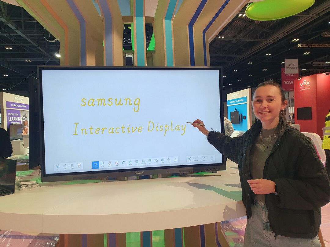| 삼성전자 직원이 유럽 최대 교육 기술 전시회 Bett 2023서 전자칠판 WAC를 소개하고 있다. [사진=삼성전자] |