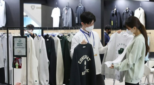 | 지난 2021년 서울 코엑스에서 열린 ‘프리뷰 인 서울’에서 방문객이 버려진 페트병을 재활용한 친환경 폴리에스터 ‘리젠 서울’ 제품 등을 살펴보고 있다. [사진=연합뉴스] |