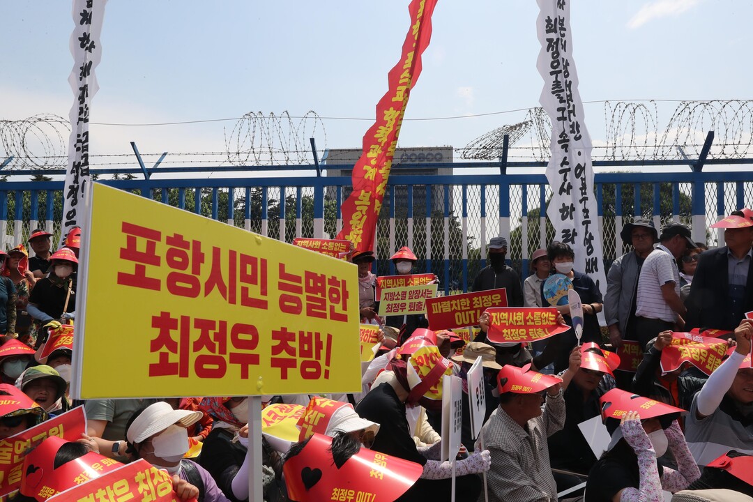 | 포항시민들이 포스코 본사 앞에서 ‘최정우 포스코홀딩스 회장 퇴진’을 촉구하는 집회를 가졌다. [사진=연합뉴스] |