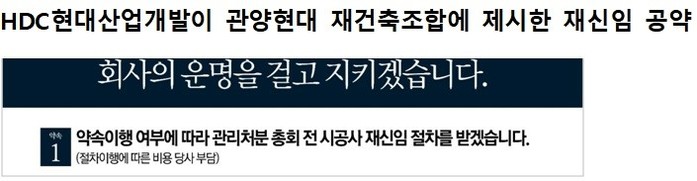 | ▲ HDC현대산업개발이 관양현대아파트 재건축조합에 제시한 재신임 공약. [사진=HDC현대산업개발] |