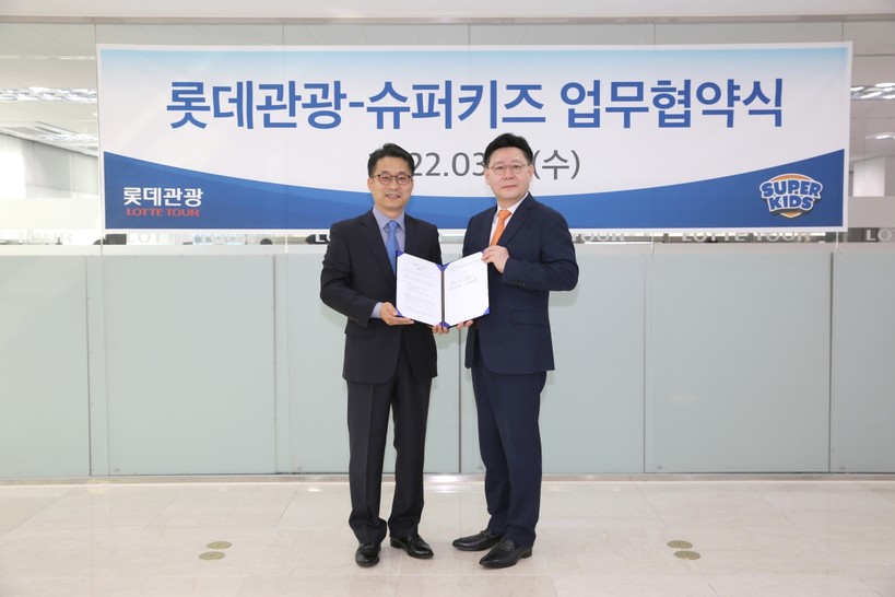 | ▲ 롯데관광개발과 슈퍼키즈홀딩스가 신규 서비스 및 공동 여행 상품 개발을 위한 업무협약을 체결했다. [사진=롯데관광개발] |