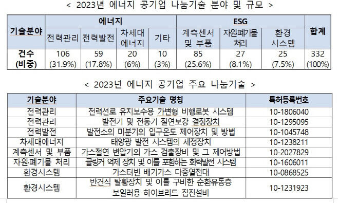 | 2024년 에너지 공기업 나눔기술 분야 및 규모, 나눔 기술 관련 자료. [자료=산업통상자원부] |