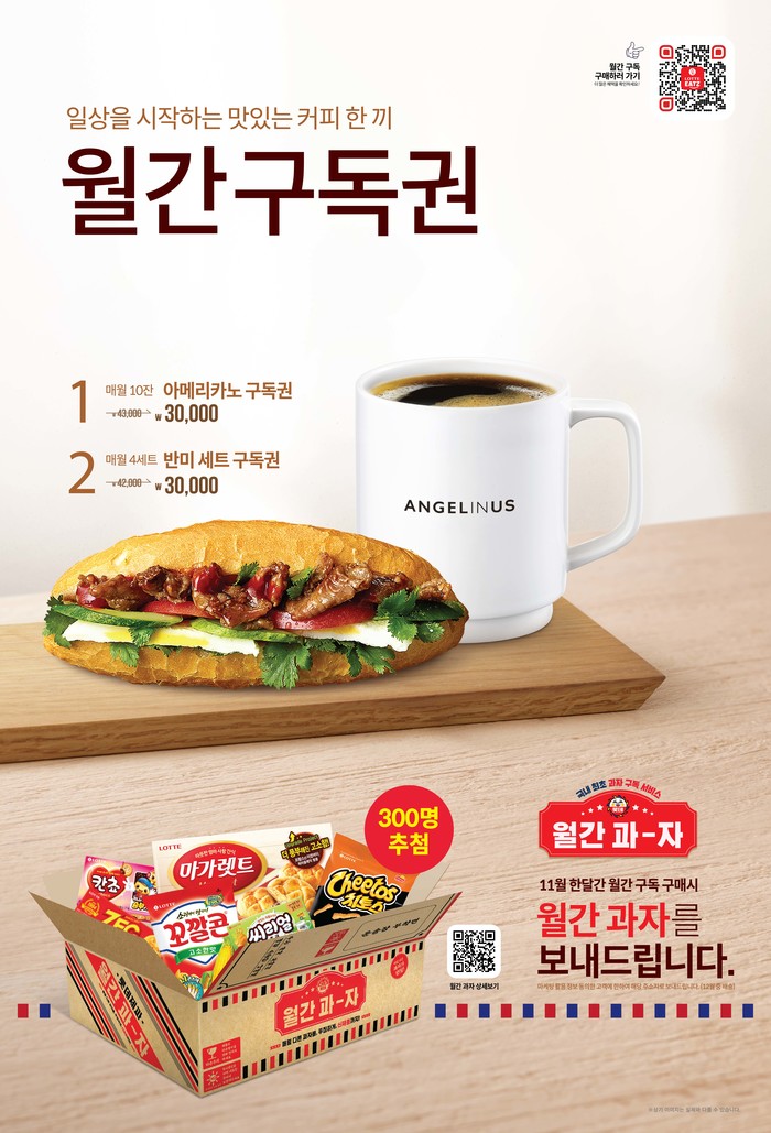 엔제리너스의 11월 ‘월간구독권’은 아메리카노 10잔을 약 30% 할인된 가격으로 구입할 수 있는 아메리카노 구독권, 반미샌드위치와 아메리카노가 한 세트로 총 4세트를 약 28% 할인된 가격인 반미세트 구독권으로 구성됐다.