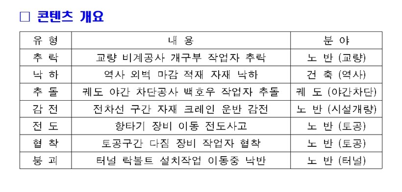 | ▲ 가상현실(VR) 철도건설 안전교육 7종 콘텐츠 현황. |