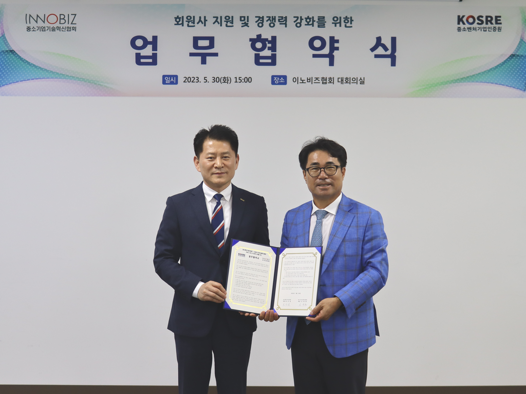 | 임병훈 이노비즈협회 회장(오른쪽 )이 중소벤처기업인증원과 업무협약 후 기념사진을 찍고 있다.[사진=이노비즈협회] |