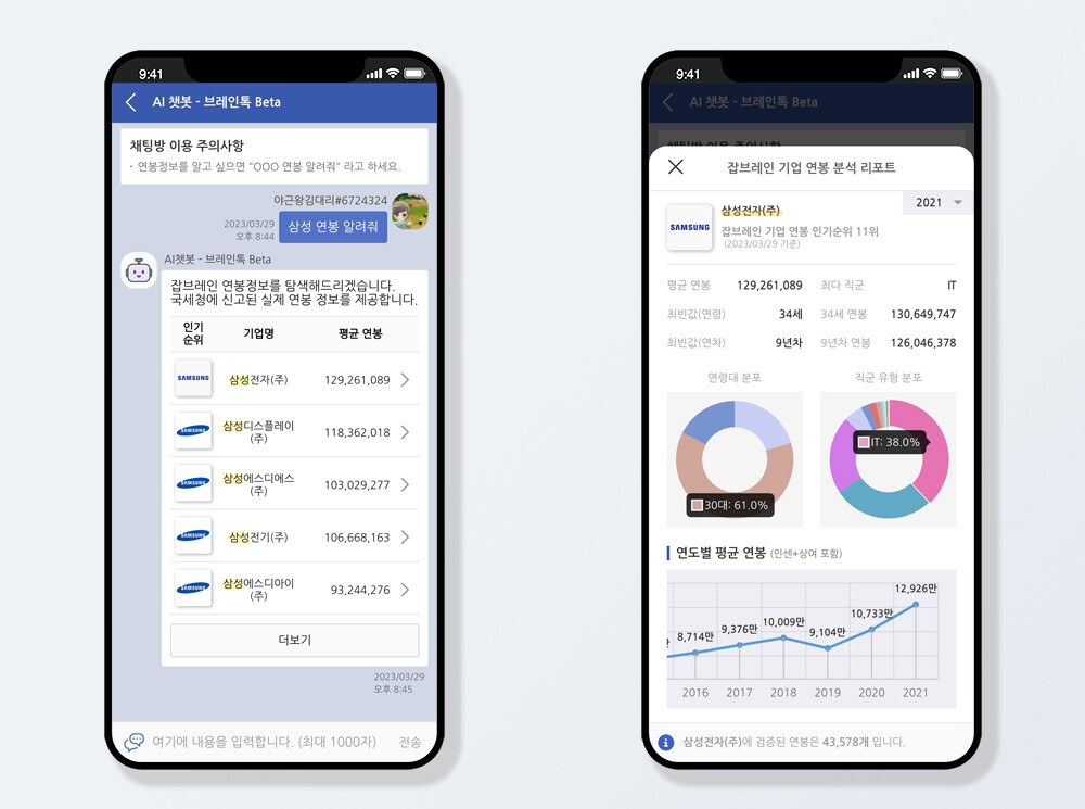 예컨대, 질문자가 “삼성 연봉 알려줘”라고 물으면 삼성전자·삼성디스플레이 등 관련 기업의 연봉 정보를 답하고, 기업별 경력·연차·나이·직군 등에 따라 분석한 리포트도 제공한다.
