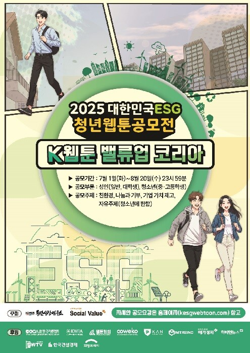 [하비엔뉴스 = 김혜연 기자] 여름방학을 맞아 동반성장연구소와 소셜밸류가 ‘2025 대한민국 ESG 청년웹툰공모전’을 개최한다고 2일 밝혔다. ‘K웹툰 밸류업 코리아’를 주제로 지난해에 이어 두 번째로 열리는 이번 공모전은 대학생과 청소년을 대상으로 사회적 가치 증진, 친환경 인식 확산, 기업 지배구조 선진화에 기여할 작품을 모집한다.