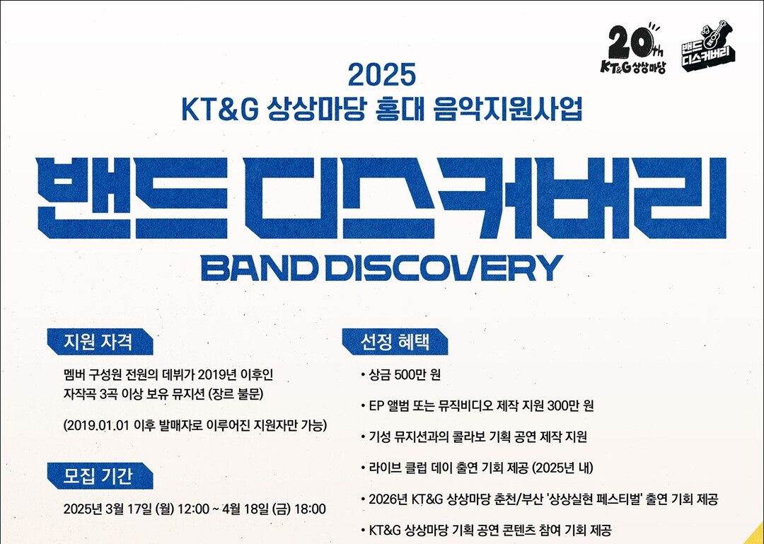 [하비엔뉴스 = 윤대헌 기자] KT&G 상상마당은 오는 4월18일까지 인디 뮤지션 발굴 및 육성을 위한 ‘2025 밴드 디스커버리’ 공모를 진행한다고 28일 밝혔다.