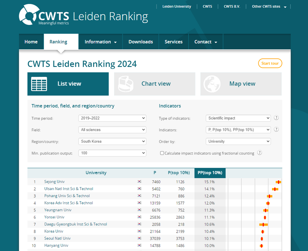 최근 4년(2019~2022년)간 800편 이상의 국제논문을 발표한 대학을 대상으로 하는 라이덴랭킹은 올해는 전 세계 1506개 대학을 평가했다. 각 대학이 발표한 논문 중 피인용도가 높은 논문(상위 10%)이 어느 정도 비율을 차지하고 있는지가 순위의 기준이 된다.