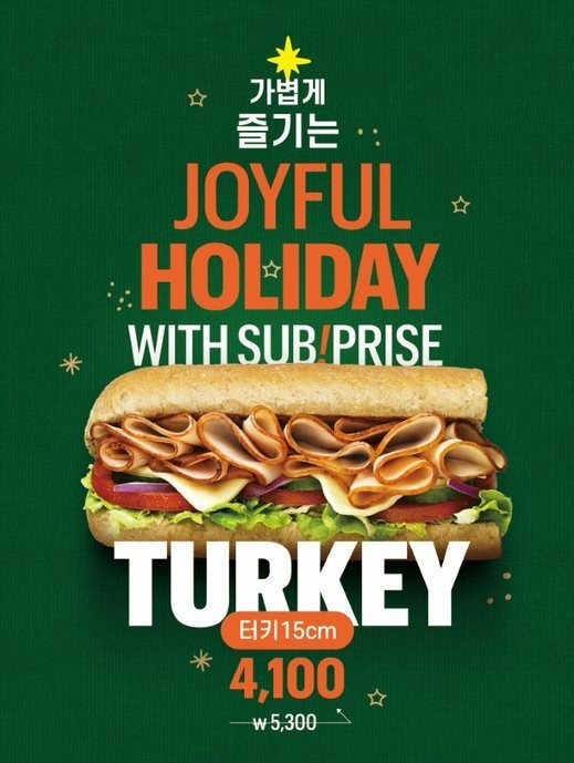 써브웨이는 터키(칠면조 고기) 샌드위치를 특별 할인가에 즐길 수 있는 ‘썹!프라이즈’ 행사를 내년 1월2일까지 진행한다.