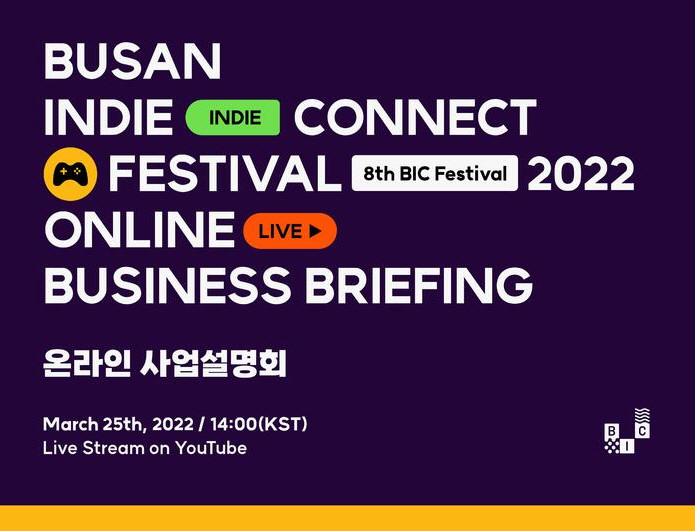 [하비엔=노유정 기자] 부산정보산업진흥원과 부산인디커넥트페스티벌조직위원회는 오는 25일 글로벌 인디게임 축제인 ‘부산인디커넥트페스티벌 2022’(이하 BIC 페스티벌 2022) 설명회를 온라인 생중계로 개최한다고 밝혔다.