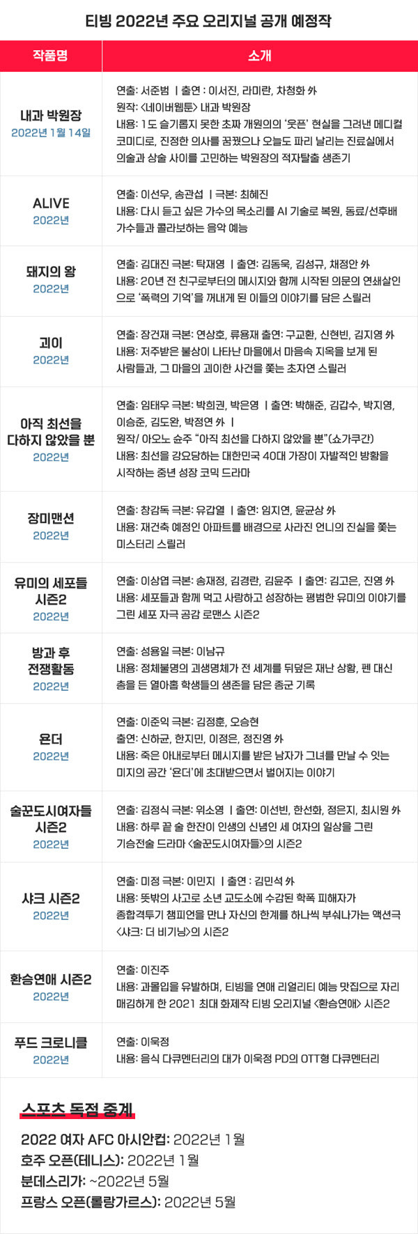 먼저 티빙의 본격적인 오리지널 시리즈가 대거 공개된다. 캐스팅만으로도 화제를 일으킨 코미디 시트콤의 진수 이서진, 라미란 출연 '내과 박원장', 연상호 작가의 초자연 스릴러 구교환, 신현빈 출연 '괴이', 동명 애니메이션 원작으로 탄탄한 스릴러의 완성체를 보여줄 김동욱, 김성규, 채정안 출연 '돼지의 왕', 일본 만화 원작으로 대한민국 중년층의 성장과 방황을 그리며 힐링과 공감을 담은 박해준, 김갑수, 박지영 출연 '아직 최선을 다하지 않았을 뿐', 영화 크리에이터가 총집합한 감각적 미스터리 스릴러 임지연, 윤균상 출연 '장미맨션'(舊더맨션), 하일권 작가 메가 히트 동명 웹툰이 화면에 펼쳐질 '방과 후 전쟁활동', 이준익 감독의 첫 OTT 드라마로 K-SF 장르를 선보일 신하균, 한지민, 이정은, 정진영 출연 '욘더' 등이다. 여기에 흥행과 화제성 두 마리 토끼를 모두 잡은 '유미의 세포들'이 시즌2로 돌아온다. 4분기 최고화제작 '술꾼도시여자들' 시즌2도 2022년 티빙 단독 공개된다.