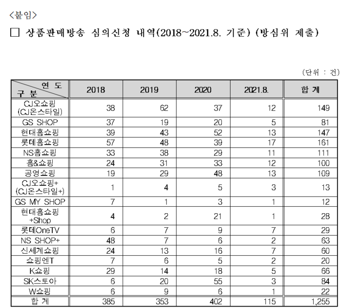 롯데홈쇼핑에 이어 CJ오쇼핑(CJ온스타일) 149건, 현대홈쇼핑 147건, NS홈쇼핑 111건, 공영쇼핑 109건, 홈&쇼핑 100건, GS SHOP 81건 등 순이었다.