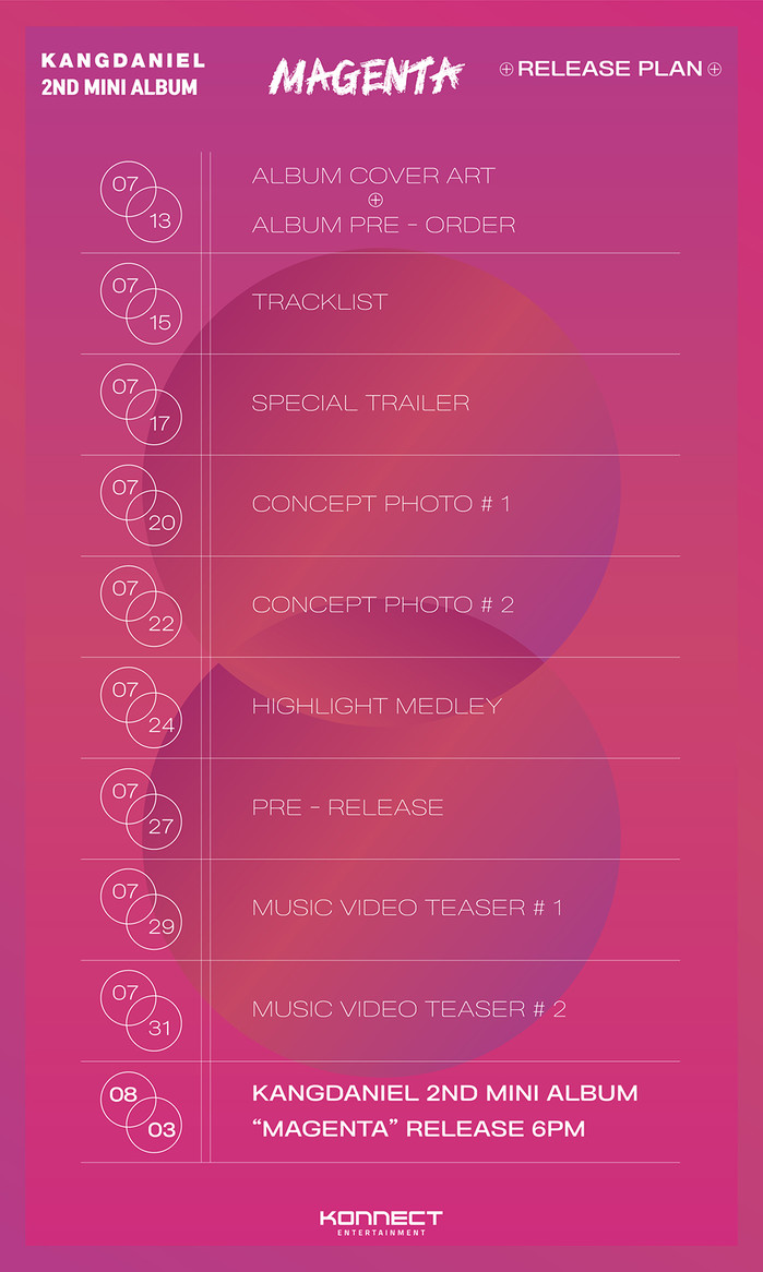 소속사 커넥트엔터테인먼트는 8일 강다니엘의 공식 홈페이지와 SNS 채널을 통해 두 번째 미니 앨범 'MAGENTA(마젠타)'의 프로모션 콘텐츠 공개 일정을 담은 릴리즈 플랜 포스터를 게재했다.