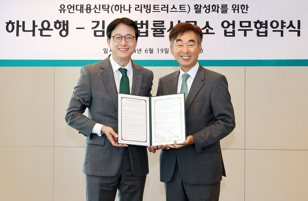 [하비엔뉴스 = 박정수 기자] 하나은행은 김·장 법률사무소와 ‘유언대용신탁’ 활성화를 위한 업무협약을 체결했다고 20일 밝혔다.
