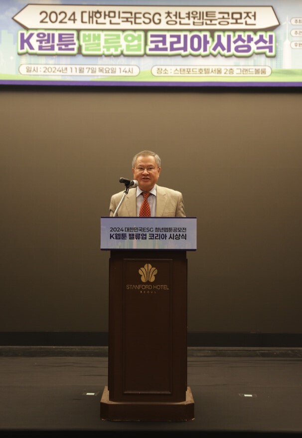 | 7일 오후 2시 서울 상암 스탠포드호텔에서 열린 ‘제1회 2024 대한민국 ESG 청년웹툰 공모전’ 시상식에서 김완묵 조직위원장이 축사를 하고 있다. |