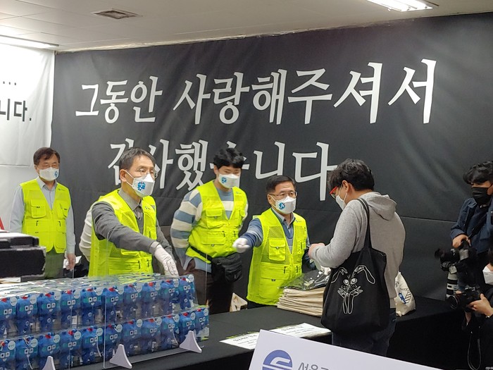 | ▲서울교통공사 김상범 사장과 직원들이 공사 캐릭터 '또타' 인형과 에코백을 판매하고 있다. |