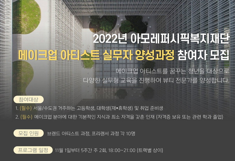 한편 ‘메이크업 아티스트 실무자 양성과정’에 관한 자세한 사항은 아모레퍼시픽복지재단 공식 홈페이지를 통해 확인할 수 있다.
