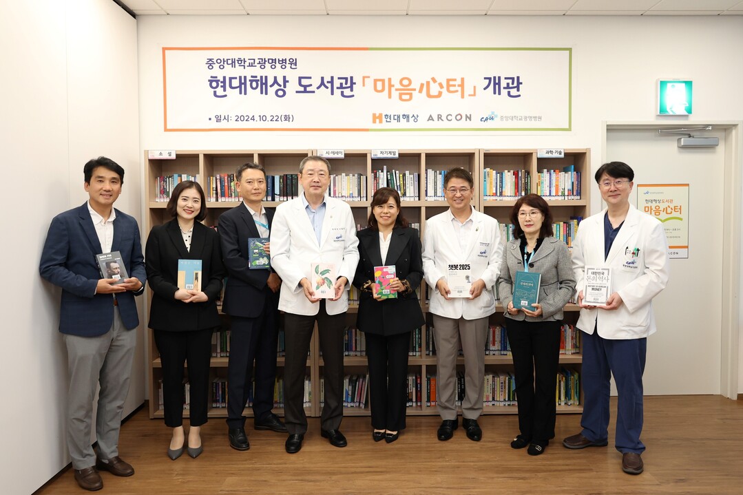 | 중앙대학교 광명병원에서 열린 ‘마음心터’ 도서관 개관식에서 관계자들이 함께 기념촬영을 하고 있다. [사진=현대해상] |
