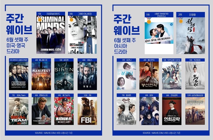 16일 주간웨이브에 따르면 '크리미널 마인드' 시리즈가 지난 주에 이어 1위를 차지, 그 외 ‘그레이 아나토미’, ‘로앤오더 성범죄전담반’ 등 스테디 인기작들이 여전히 상위권을 유지하였으며, ‘매그넘 P.I’가 9위로 신규 진입했다.