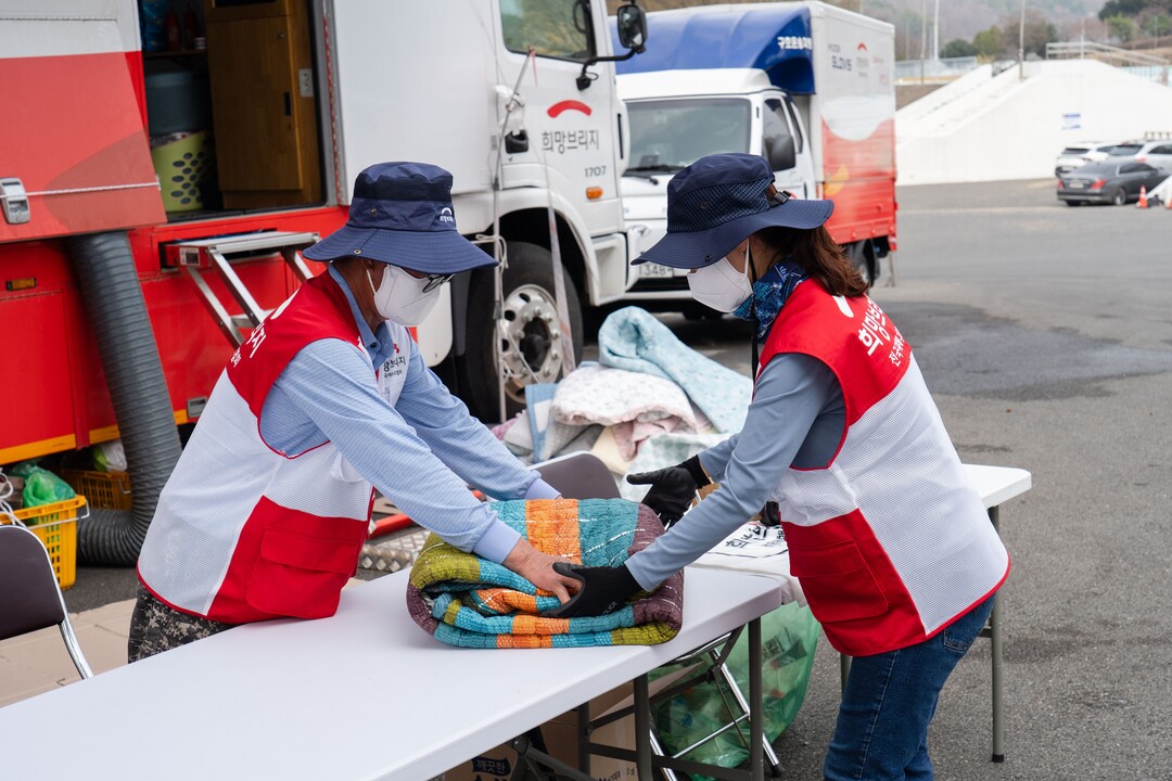 | 희망브리지 직원 및 자원봉사자가 경북 의성군 이재민 대피소에서 세탁봉사활동을 하고 있다. [사진=희망브리지] |