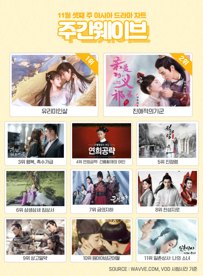 [하비엔=노이슬 기자] 11월 셋째 주 주간웨이브(wavve) 아시아 드라마 차트는 신규 업데이트된 중국 드라마 작품들이 시청 시간 상승을 견인하며 차트에 이름을 올렸다.