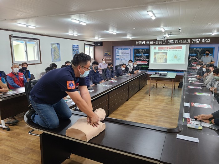 | ▲국가철도공단 강원본부는 8일 미로~동해간 전차선로 개량 현장상황실에서 현장 근로자 응급처치 교육을 시행하였다. |
