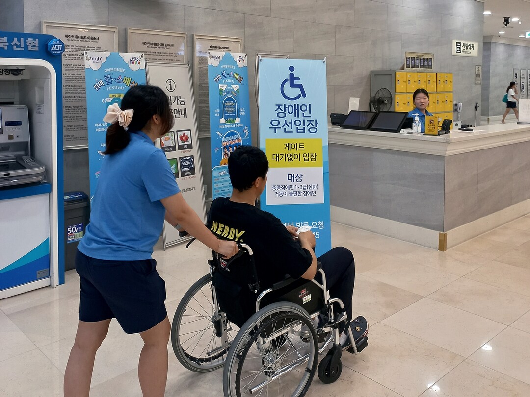 우선 하이원워터월드 이용 시 장애인 증빙이 가능한 고객과 동반자는 별도의 대기시간 없이 따로 마련된 장애인 전용 창구를 이용해 발권 후 우선 입장이 가능하다. 특히 입장 게이트에서는 거동이 불편한 고객을 위해 휠체어 무상 대여 서비스를 제공한다.