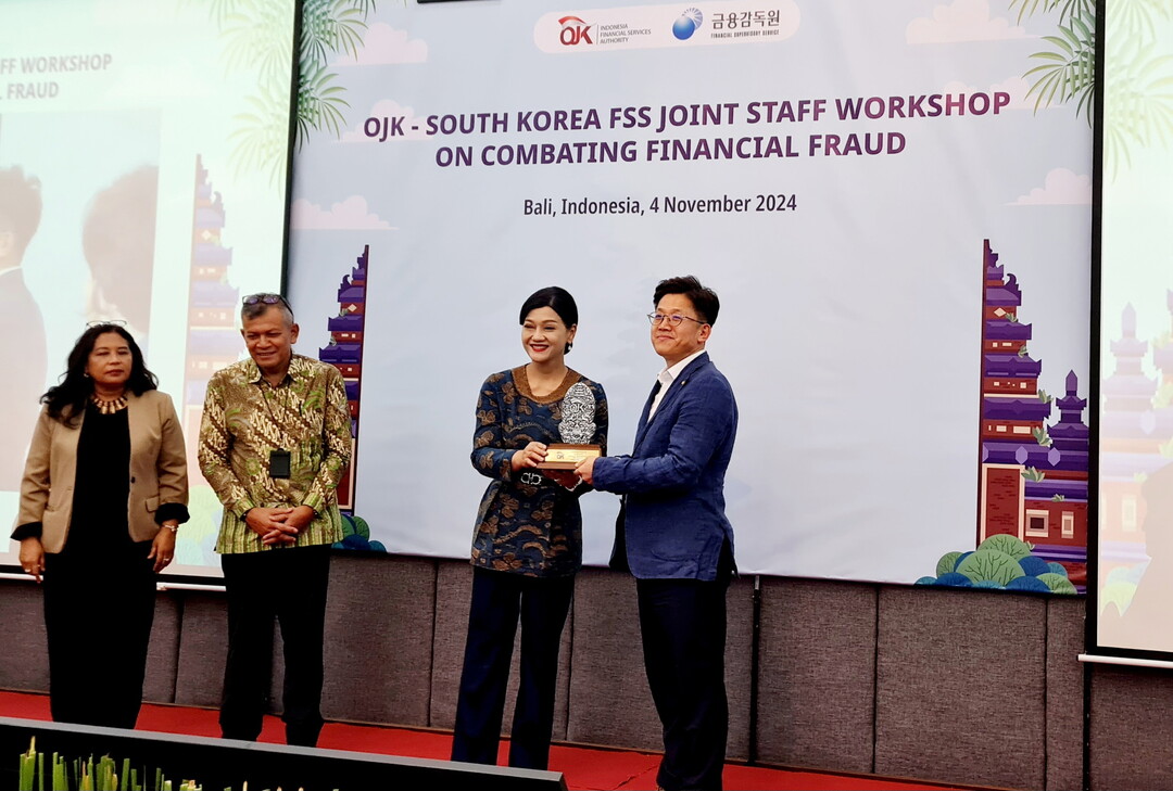 | 장종명 한화생명 융자Digital사업부 팀장(오른쪽)이 프리데리카 위디야사리 데위 인도네시아 금융감독청 소비자보호 담당 최고 책임자로부터 감사패를 받고 있다. [사진=한화생명] |