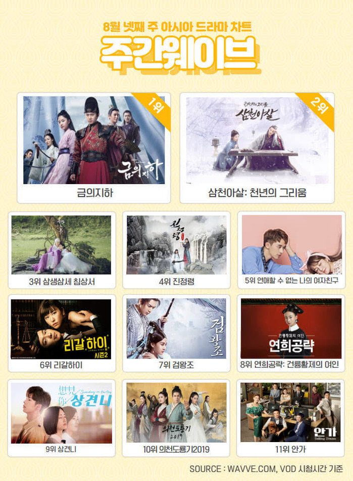 한편 올해 중국에서 제작된 드라마 ‘안가’가 8월 넷째주 주간웨이브 차트 11위에 입성했다.