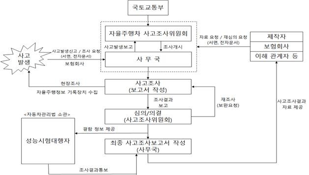 사고조사의 개시는 자율주행자동차 사고발생 시, 관련 사고를 접수한 보험회사가 사고조사위원회에 사고 발생사실을 통보하면 사고조사위원회는 사고 관련 자율주행자동차에 부착된 자율주행정보 기록장치 등에 기록된 내용을 확보해 조사를 시작한다.