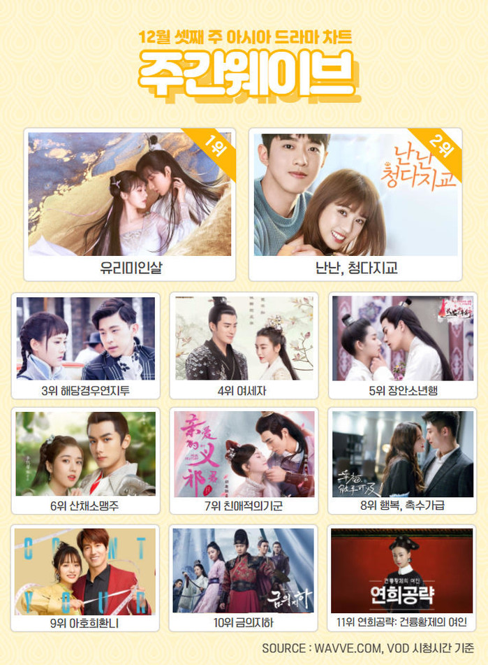 [하비엔=노이슬 기자] 12월 셋째 주 주간웨이브(wavve) 아시아드라마 차트에는 전에 없던 작품들이 얼굴을 내밀었다. 지난주 4개 작품이 신작 신호탄을 쏜 것에 이어 이번 주 '여세자'와 '산채소맹주'가 기세를 이어가고 있다.