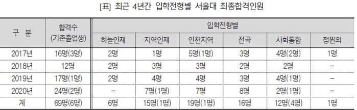한편, 인천하늘고등학교는 지난해 서울대학교 합격자 24명, 2019년 17명, 2018년 12명, 2017년 16명을 배출하는 등 인천 지역의 명문고로 손꼽히고 있다.
