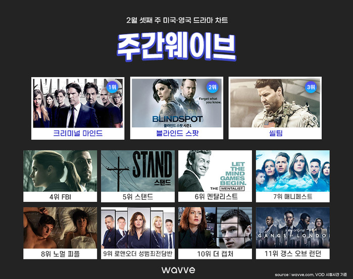 시즌 15의 저력을 자랑하는 '크리미널 마인드'는 2월 셋째 주에도 1위를 차지했다. 다니엘 헤니가 '맷 시몬스' 역을 맡아 스핀오픈작인 '크리미널 마인드: 국제범죄수사팀' 출연에 이어 '크리미널 마인드' 정규 시즌 13부터 캐스팅 되어 큰 화제를 불러 모았다.