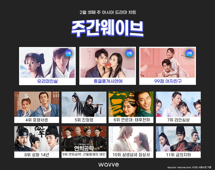 [하비엔=노이슬 기자] 주간웨이브 아시아드라마 차트에는 2월 업데이트된 신작들의 활약이 돋보였다. 그 중에서도 특히 현대 로맨스물이 높은 시청 시간을 기록했다.