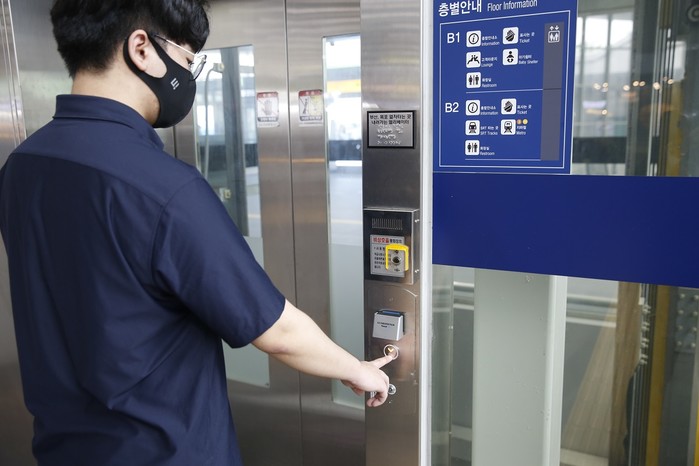 | ▲ SR은 코로나19 예방을 위해 역사 엘리베이터 버튼 상단에 자외선 살균장치를 설치해 고객이 안심하고 SRT를 이용할 수 있는 환경을 조성했다. |