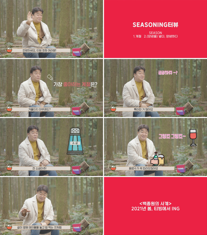 그동안 <여고추리반> 드로잉터뷰, <당신의 운명을 쓰고 있습니다> 라이팅터뷰 등 작품의 매력을 색다르게 표현해온 티빙은 이번 시즈닝터뷰를 통해 계절(Season)과 음식의 맛을 살리는 양념(Seasoning)에 대한 백종원의 솔직하고 재미있는 속마음을 공개했다.