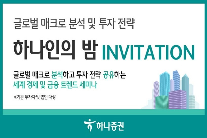 ‘글로벌 하나인의 밤’은 에릭 놀란드 CME Group 시니어 이코노미스트와 정유탁 하나금융연구소 연구원을 초빙해 글로벌 금융시장을 점검하고 투자전략을 공유하기 위해 마련된 행사로, 글로벌 주식과 채권, 원자재·외환(FX) 시장현황을 체크하고 투자전략을 살펴볼 수 있다.