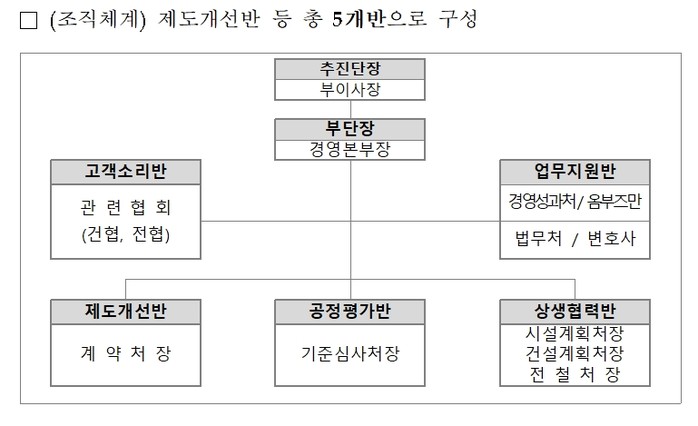 세부적으로 제도개선반은 ‘계약제도 혁신 TF’ 컨트롤타워로 업무를 총괄하며, 공정평가반은 일괄 입찰(턴키), 용역 종합심사낙찰제 등 각종 입찰에서 기술력과 안전 능력이 우선되는 투명한 평가방안을 수립한다.