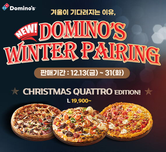 도미노피자 관계자는 “크리스마스와 연말을 맞아 다양한 메뉴를 한 판에 즐길 수 있는 콰트로 피자 3종을 출시했다”며 “소중한 사람들과 함께 피자를 즐기며 행복한 시간을 보내시길 바란다”라고 말했다.