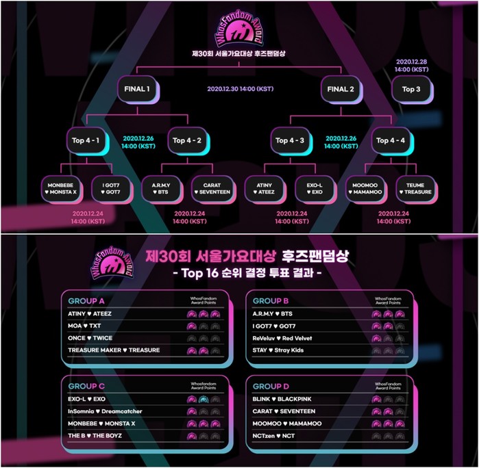 글로벌 케이팝 팬덤 플랫폼 후즈팬(Whosfan)은 제30회 서울가요대상에서 시상되는 후즈팬덤상 '톱 16(Top 16)' 투표가 23일 오전에 종료되었다고 공식 발표했다.