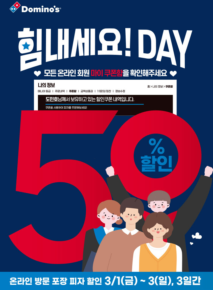이를 위해 도미노피자는 모든 온라인 회원을 대상으로 3월1~3일 사이에 사용할 수 있는 50% 할인 쿠폰을 제공하고, 해당 쿠폰은 2판까지 적용 가능하다.