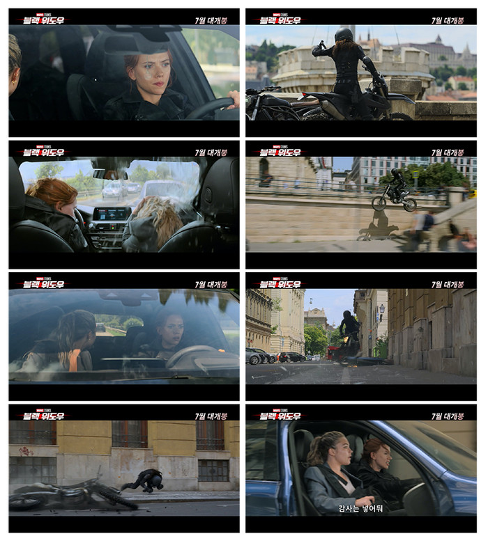 이번 영상은 오직 ‘블랙 위도우’만이 선보일 수 있는 고난도의 리얼 액션들이 펼쳐져 보는 이들을 압도한다. 특히 도로 한복판에서의 아슬아슬한 액션 장면들과 위기의 순간, 차량을 회전시켜 조수석 문짝을 이용해 적을 쫓는 ‘옐레나 벨로바’의 기발한 아이디어는 보는 이들에게 짜릿한 카타르시스를 선사한다. 여기에 총알이 빗발치는 일촉즉발의 상황에서 ‘옐레나 벨로바’의 “작전 없어? 아니면 계속 숙이고 있어?”라는 물음에 ‘블랙 위도우’는 “그냥 튀는 게 작전이었어”라고 답하며 친자매 같은 티키타카를 선보여 유쾌한 웃음을 자아낸다. 이렇듯 위기일발의 상황에서도 허를 찌르는 마블 특유의 유머는 영화의 재미를 더하며 개봉을 기다리는 전 세계 팬들의 기대감을 드높인다.