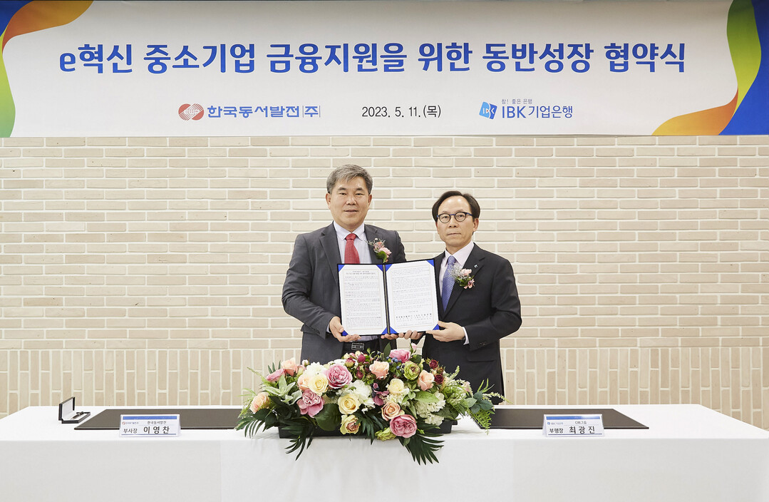 이날 IBK기업은행과 한국동서발전은 을지로 IBK파이낸스타워에서 ‘e혁신 중소기업의 금융지원을 위한 동반성장 협약’을 체결했다.