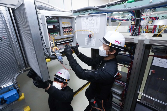 | ▲ LG유플러스는 에너지 사용량을 줄이기 위해 원격으로 사용량을 점검할 수 있는 모니터링 시스템을 구축할 계획이라고 7일 밝혔다. 사진은 LG유플러스 협력 업체 직원들이 마곡국사에 구축된 외기냉방 시스템을 점검하는 모습. |