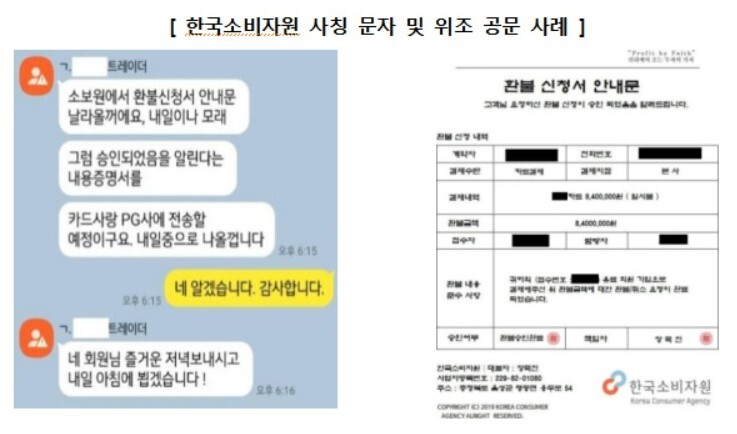 특히 소비자가 받은 문자메시지에는 한국소비자원에서 발송한 공문인 것처럼 조작한 ‘환불 신청서 안내문’이 첨부돼 있고, 위조 공문에는 결제내역와 환불금액 등 허위 내용이 기재돼 있다.