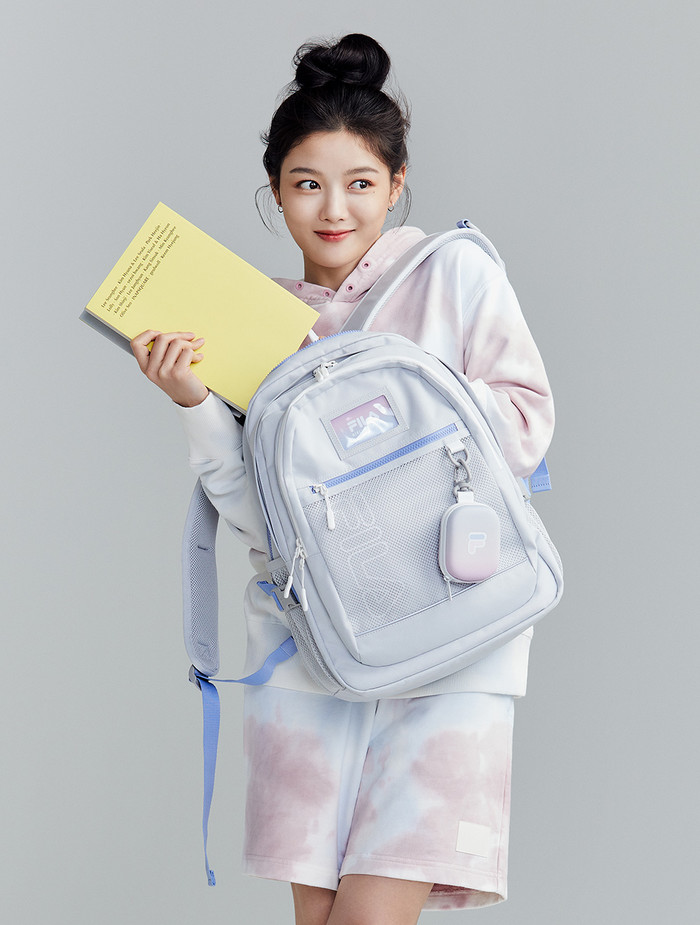 가방 앞면에 사용된 메시 소재에 언뜻 비치는 휠라 로고가 감각적인 분위기를 자아낸다. 여기에 전면 히든 포켓과 탈부착이 가능한 몰드형 참(Charm) 장식 파우치로 수납 실용성을 더해 가방의 완성도를 높였다.