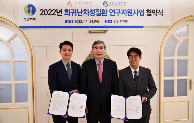| ▲ 지난 24일 열린 희귀난치성 질환 연구지원 협약식에서 이관순 임성기재단 이사장(가운데)과 이재철 교수(오른쪽), 이인균 연구원(왼쪽)이 기념촬영을 하고 있다.[사진=임성기재단] |
